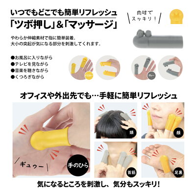 ■商品名:グイ押し もみたいにゃー ■JANコード:イエロー4562226255504、グレー4562226255498 ■セット内容:4個入 ■使用方法 使用する指に本品を肉球側が手のひら側になるように装着してください。